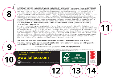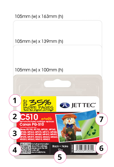 Rechts abgebildet sehen Sie die kleinere der beiden Größen unserer Blisterverpackungen inklusive Erklärungen zu allen Elementen. Bei allen Jet Tec-Verpackungen werden mindestens 50% wiederaufbereitetes oder recyceltes Material verwendet.